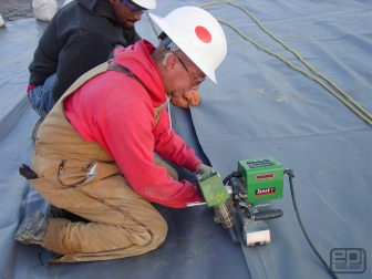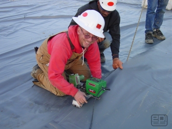 The 296,750 square feet of 30 mil PVC was deployed, field welded and tested by trained EPI installers. All field seams were welded using a dual track thermal weld. Dual track welding and air channel testing allowed 100% of field seams to be non-destructively and destructively tested. In 2 instances, EPI Technicians were able to use the air channel test to actually peel apart seams from the inside out. These areas of below specification seam strength were located, removed and repaired. The comment was made "air lance testing would have never found that weak area... only if by chance you took a destructive sample from that area would you have found those inadequate seams." At Environmental Protection, Inc. we absolutely agree with this. Air channel testing provides the ability to test 100% of the field seams for continuity AND STRENGTH. Any voids, pinholes, or flaws can be located and repaired. And, areas of low seam peel strength can be located and re-welded BEFORE any soil cover is placed on the liner. Both the Engineer and the MDEQ Inspector agreed that this testing method works, and is far superior to air lance testing.