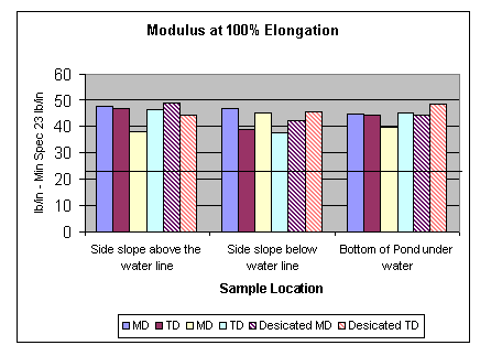 It was noted during sample removal that the newly exposed material felt like new liner that would be installed in today’s projects. It was also noted, that in a very short time the material began to loose a little of its flexibility as the material dried out. This is evidenced in the results of ultimate elongation tests run on the 18 different samples. The material that was acclimated in the lab and allowed to dry out, exhibited lower ultimate elongation in two cases, than those samples that were tested without acclimation.