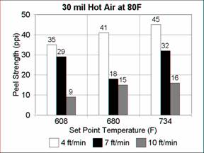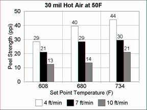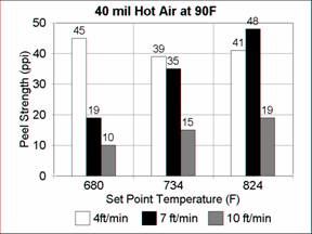 As before, the effect of speed is greater than the effect of temperature. A speed of 19 ft/min is obviously too fast for 40 mil but made reasonable 30 mil seams.